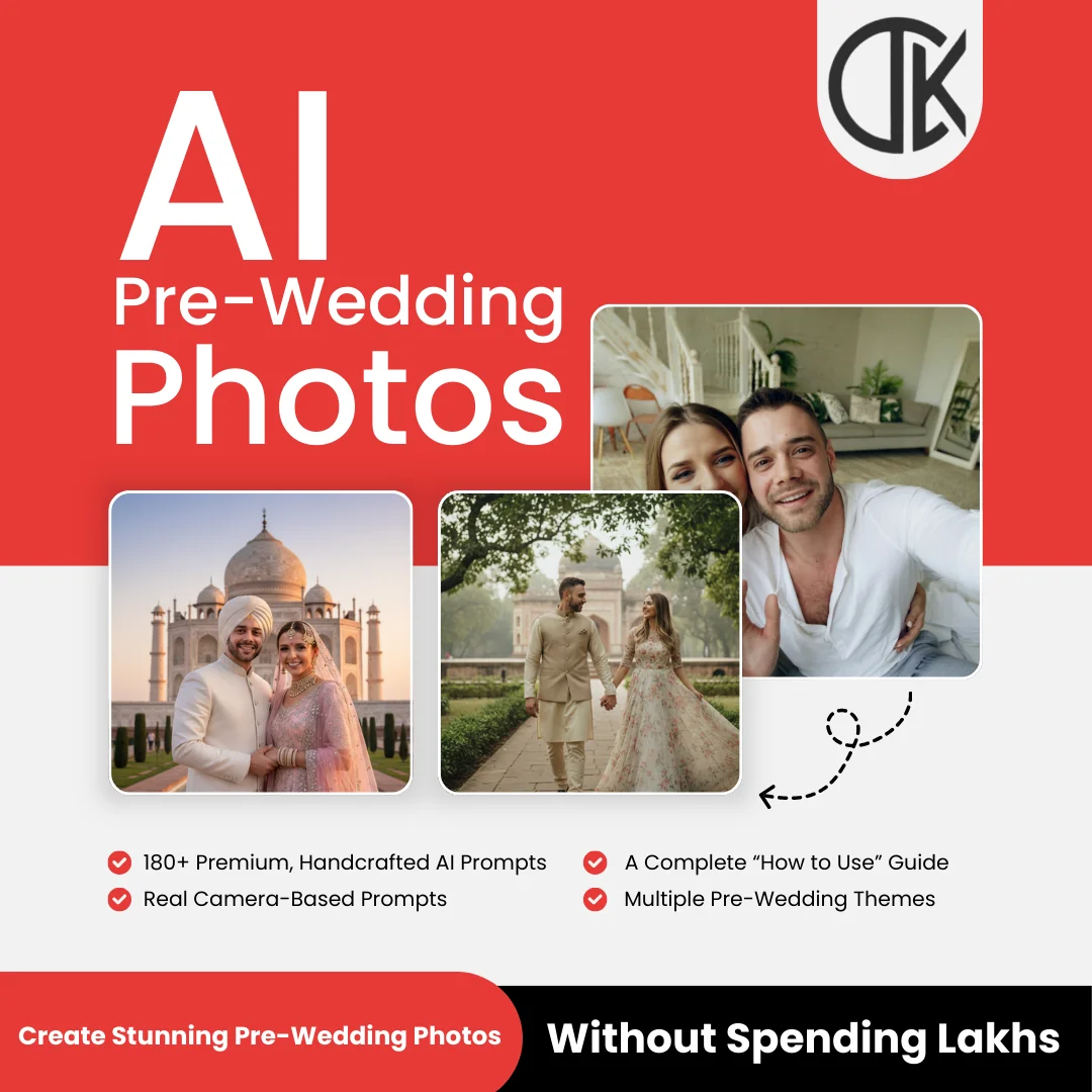 With the OTK Pre-Wedding Photoshoots Prompt Pack, you can turn ANY couple photo into cinematic, hyper-realistic Indian pre-wedding images — all using AI tools like ChatGPT, Gemini, MidJourney & more.
